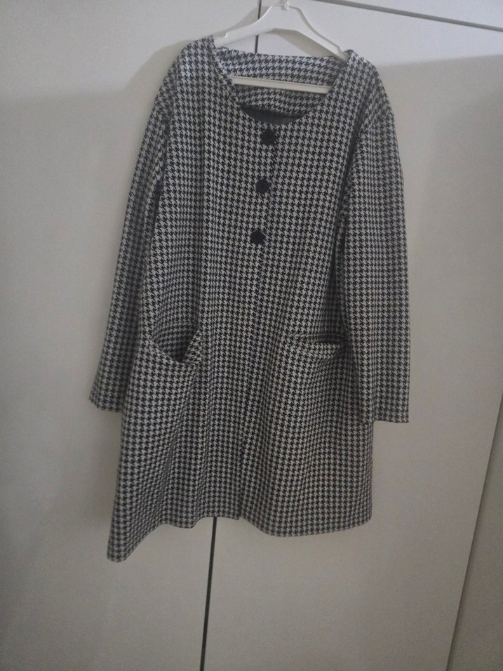 Düğmeli, uzun kollu, gevşek kesim kadın kaban. Gri kazayağı desenli, midi boy ve yapay kumaştan üretilmiştir. Rahat günlük kullanım için uygundur.