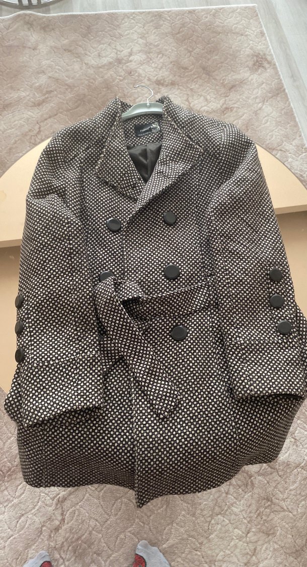 Düğmeli, notched lapel yakalı, uzun kollu midi uzunlukta, regular fit gri kadın kaban. Streetwear tarzında, günlük kullanıma uygun, desenli dokusu vardır.