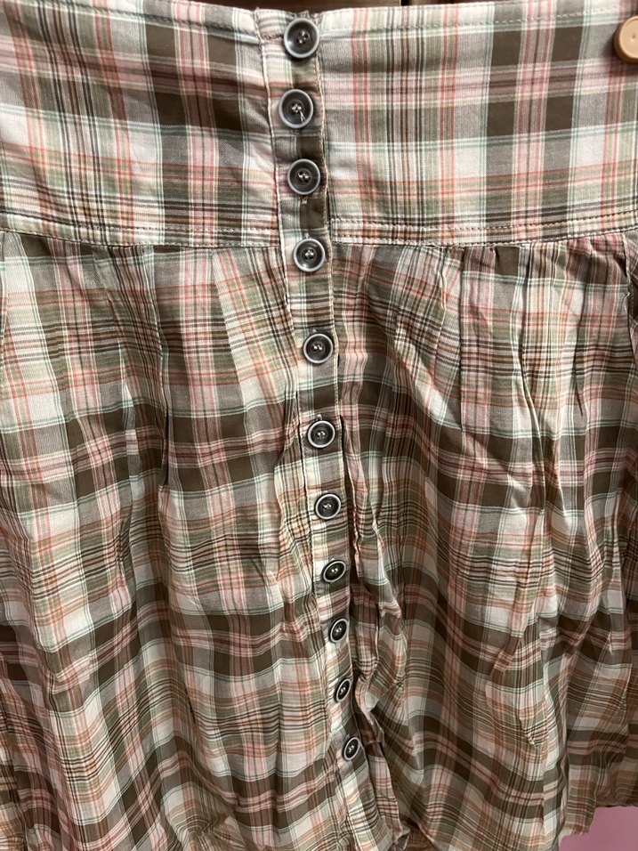 Bej ve gri tonlarda, yumuşak pamuktan yapılmış, düğmeli, bol kesim mini eteği. Günlük rahat kullanım için uygundur.