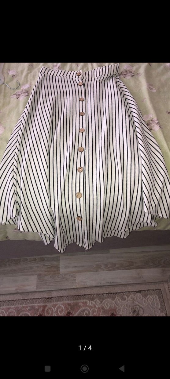 Düğmeli ön kısmı ve zebra desenli, bol kesim midi hamile eteği. Hafif beyaz tonlarında, günlük kullanıma uygun bohem tarzda.