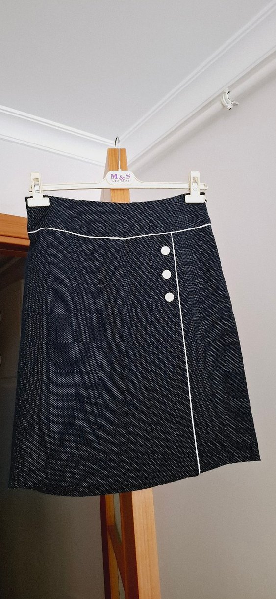 Gri renkte, düğmeli ve kontrast şerit detaylı midi uzunlukta hamile kot etek. Ofis kullanımı için uygun, rahat kesim.