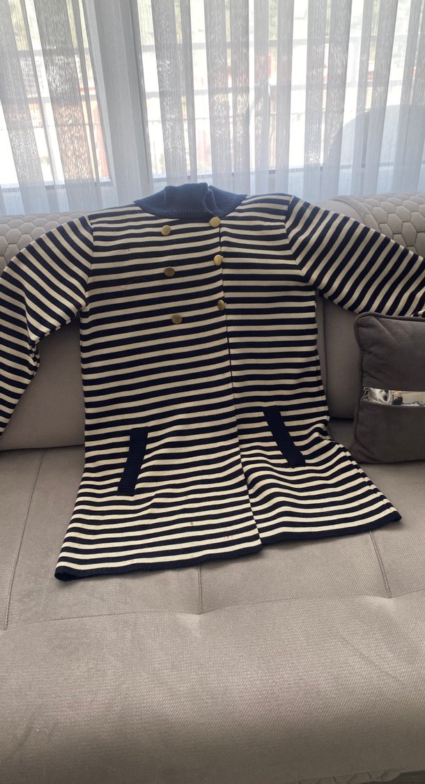 Düğmeli ön kısmı, uzun kollu ve yakası yüksek detaylı, çizgili desenli, normal midi boyda, rahat ve sıcak tutan kumaştan yapılmış # triko hırka