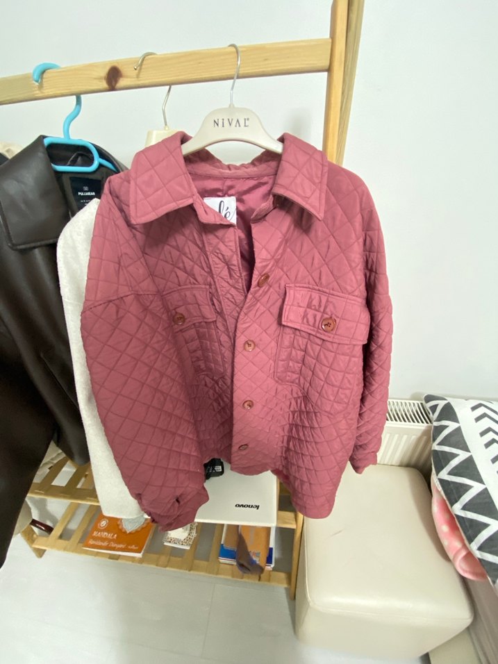 koyu pembe tonlarında renkli, düğmeli, uzun kollu, normal midi boyda kadın ceket. Sentetik kumaştan, rahat kesimli, notched lapel yakalı, günlük kullanıma uygun, desen içermeyen streetwear tarzında. çok giyilmedi