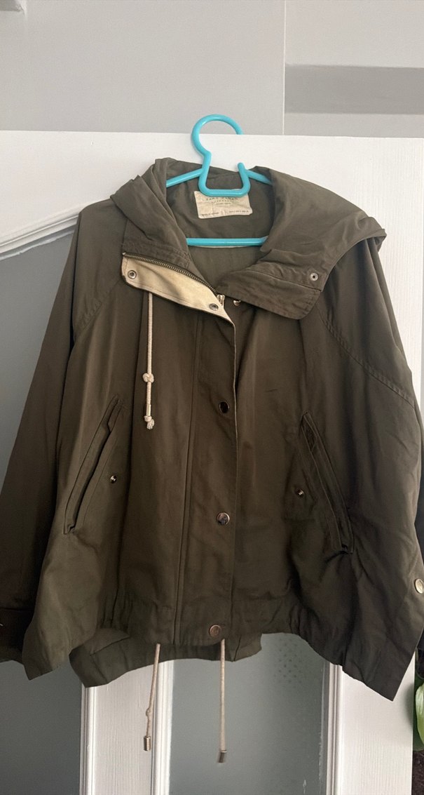 Düğmeli, uzun kollu ve notlu yaka detaylı, salaş kesim midi kadın ceket. Bej tonlarında, sentetik kumaştan, günlük ve sokak stiline uygun.
