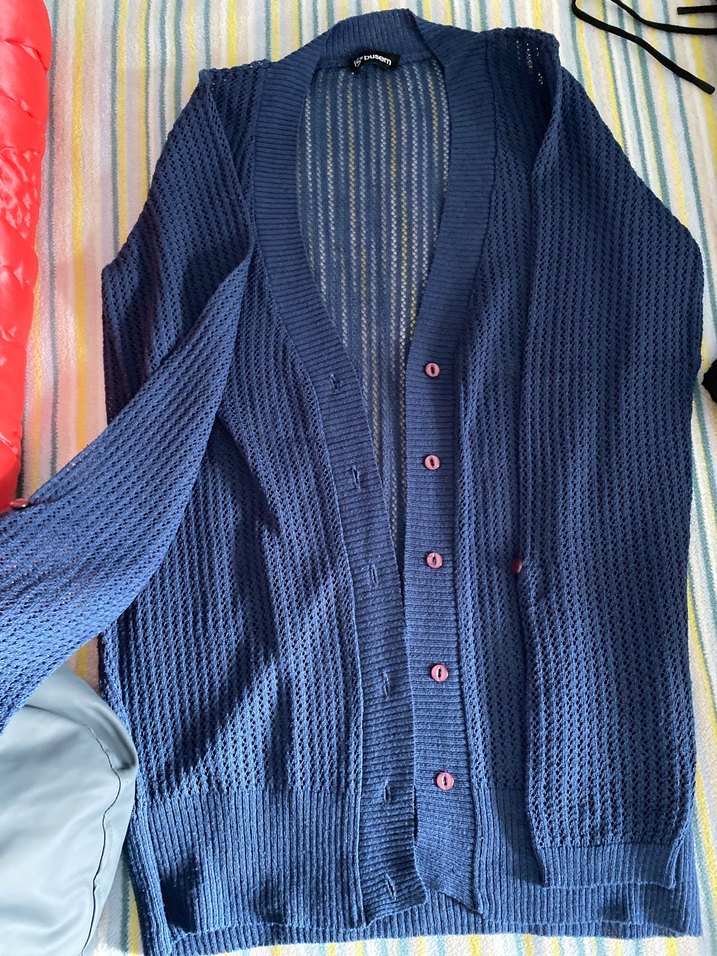 Düğmeli ön kısmı, uzun kollu ve yakalı, midi boyda koyu mavi triko hırka. Rahat kesimiyle günlük kullanıma uygundur.