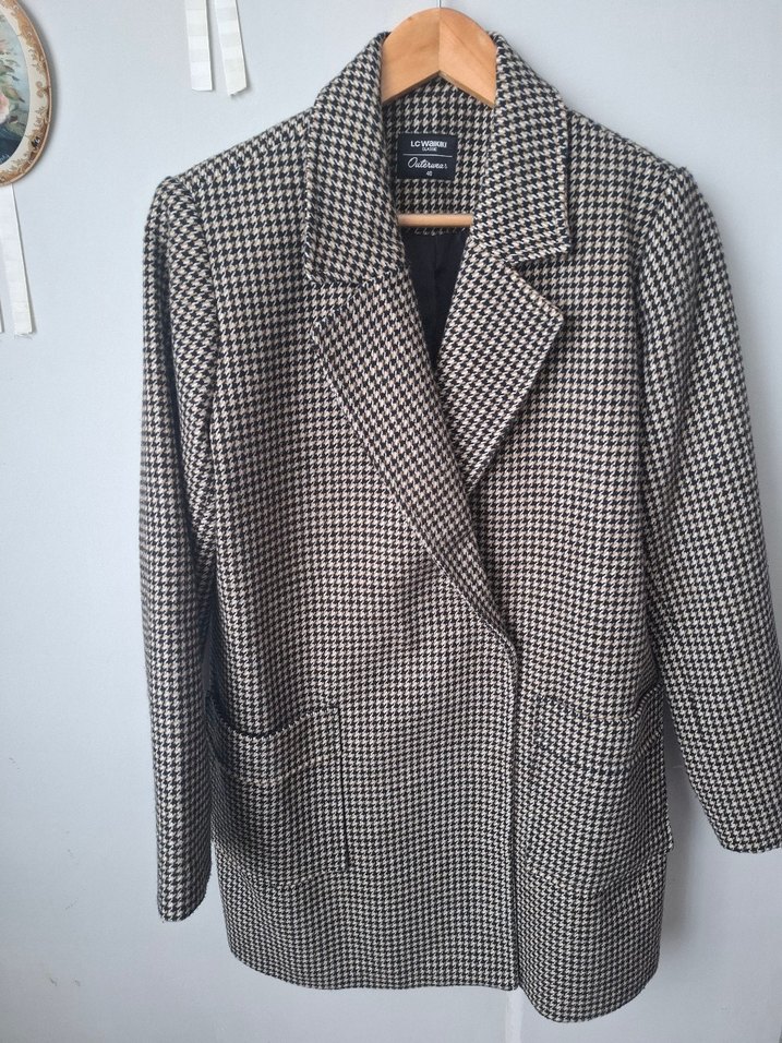 Düğmeli önü, klasik yakalı ve uzun kollu midi kadın ceketi. Ofis için uygun, sentetik kumaştan, gri ve kahverengi desenli.