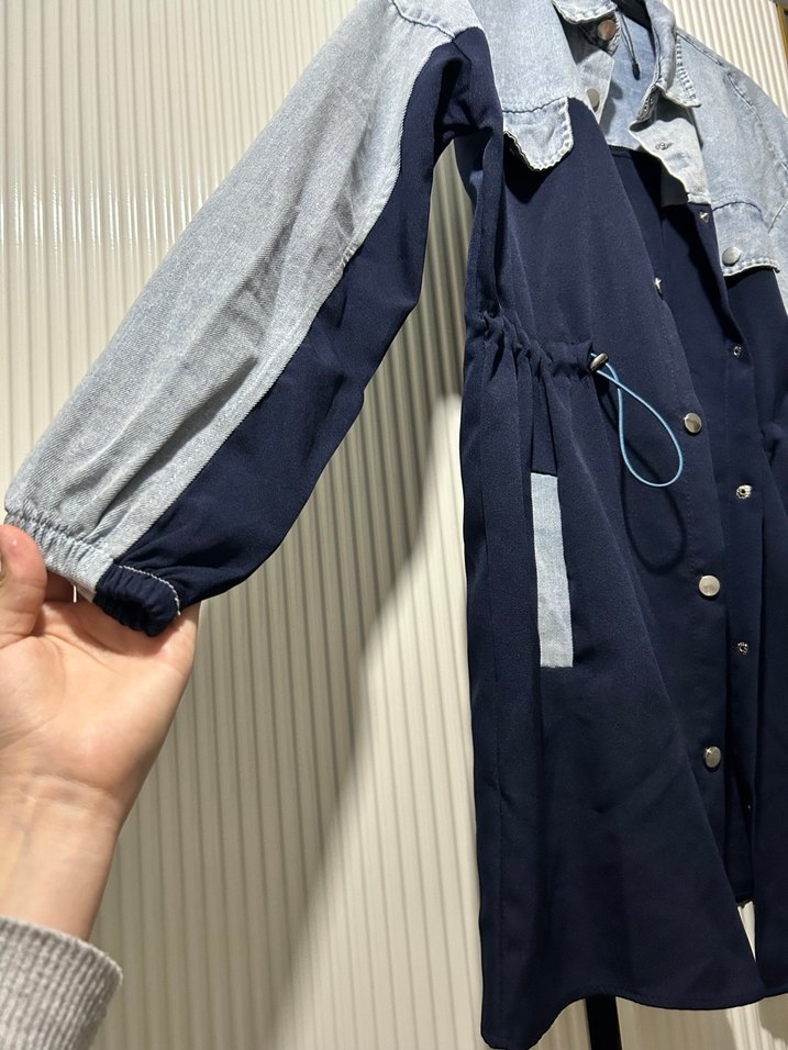 Düğmeli, uzun kollu, notched lapel yakalı, gri ve mavi tonlarda midi uzunlukta rahat kesim kadın kot ceket. Casual tarz için uygundur.