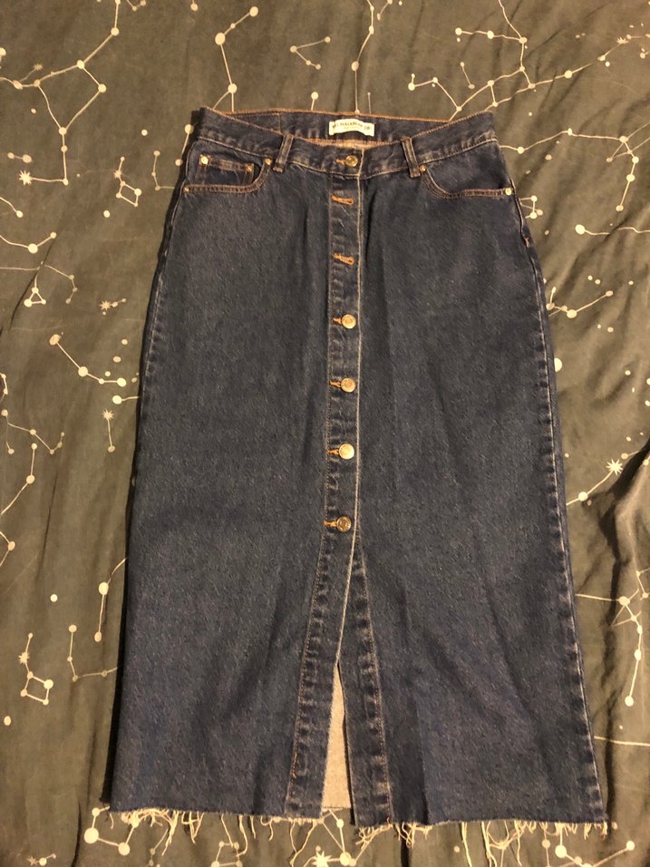 Düğmeli ön kısmı ve normal kesimiyle kot midi etek, günlük sokak stiline uygun rahat bir tasarıma sahiptir.