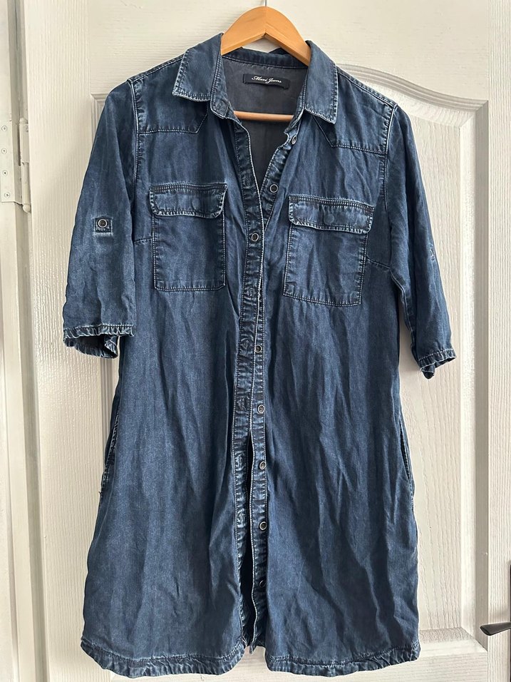 Düğmeli ön ve cep detaylı, kısa kollu, notalı yaka midi kot elbise. Rahat kesimiyle günlük kullanıma uygundur.