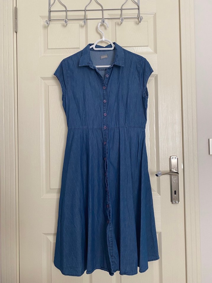 M-L bedenlere uygun öğrenci olduğum ıcın satıyorum kusuru yok. Düğmeli kolsuz midi elbise, yumuşak kot kumaştan, kesik yakalı. Bol kesim ve bohem tarzda, günlük kullanıma uygun lacivert renkte.