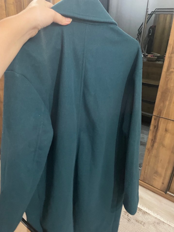 Düğmeli, koyu mavi midi hamile kaban. Notlu yakalı, uzun kollu ve bol kesim, sentetik kumaştan üretilmiştir.