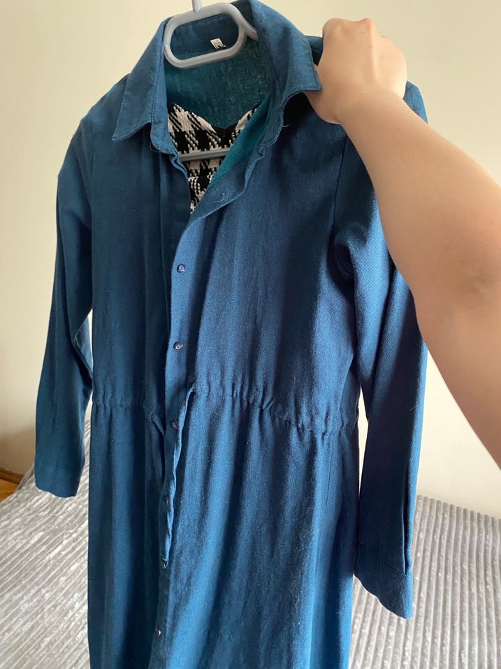 Düğmeli, uzun kollu, yakalı ve midi boy mavi . Rahat kesimli ve yumuşak keten kumaştan üretilmiştir, günlük kullanıma uygundur.