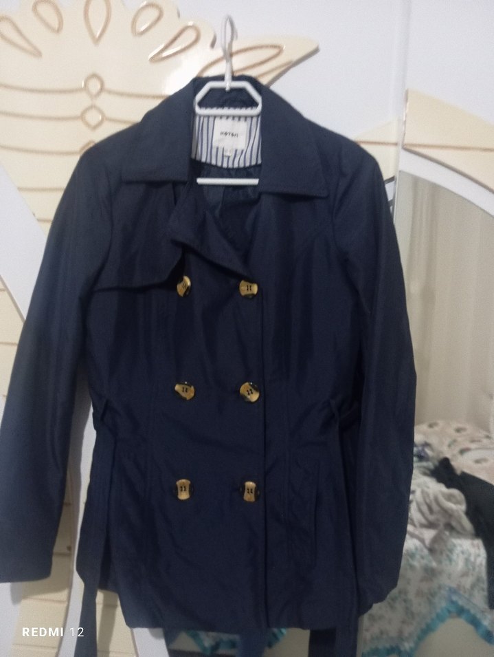 Düğmeli ve midi uzunlukta, fit lacivert trençkot. ofis kullanımı için uygun, desensiz tasarım.