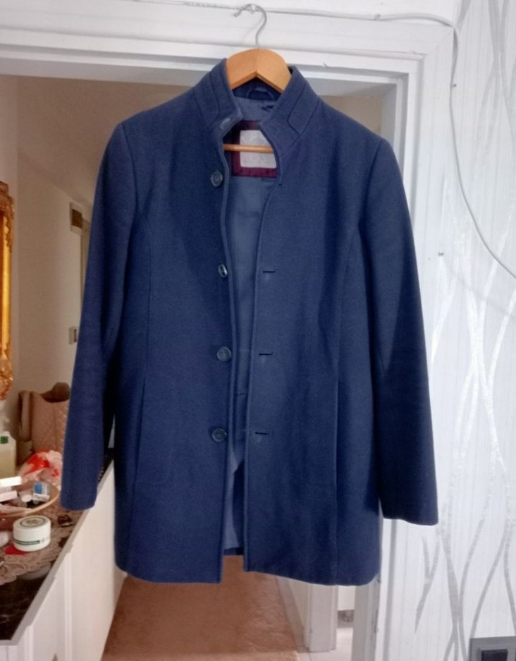 Bu lacivert düğmeli, uzun kollu ve kesik yakalıdır. Normal kesim ve midi boydadır, yumuşak kumaştan üretilmiştir, ofis için uygundur. boy 70 cm en 55 cm