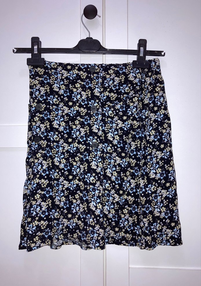 Düğmeli Midi Mavi Çiçek Desenli Etek