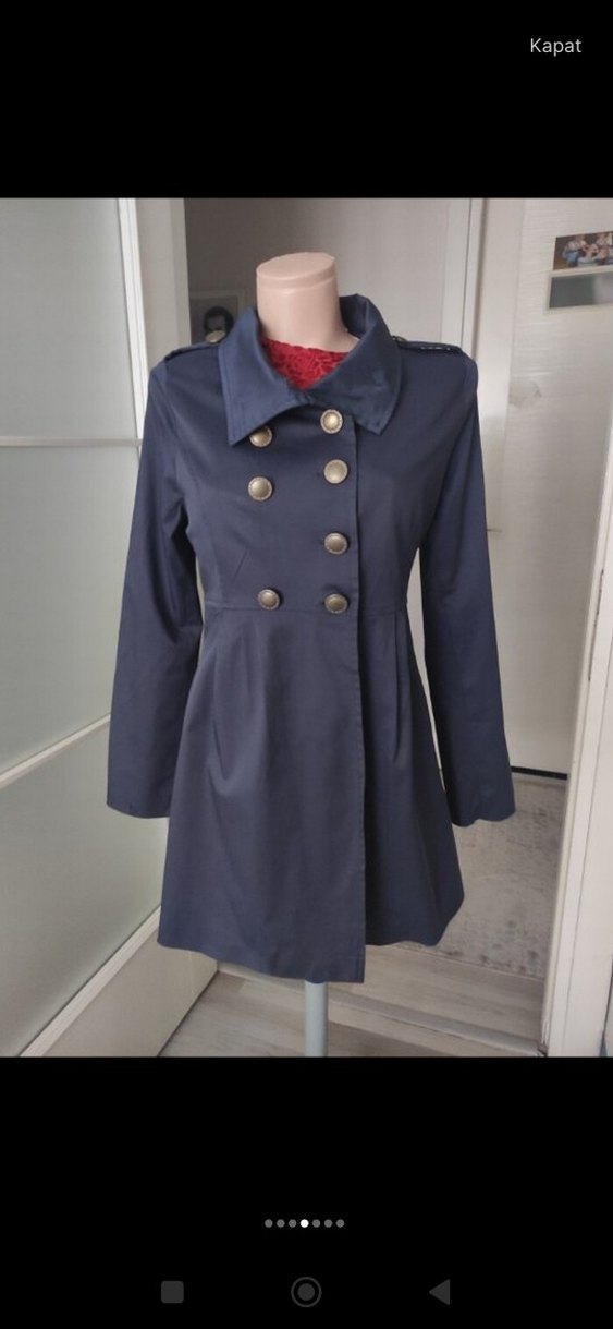 Düğmeli ön kısmı ve geniş yakasıyla, uzun kollu midi boy mavi trençkot. Sentetik kumaştan, ofis için uygun, rahat ve şık bir modeldir.