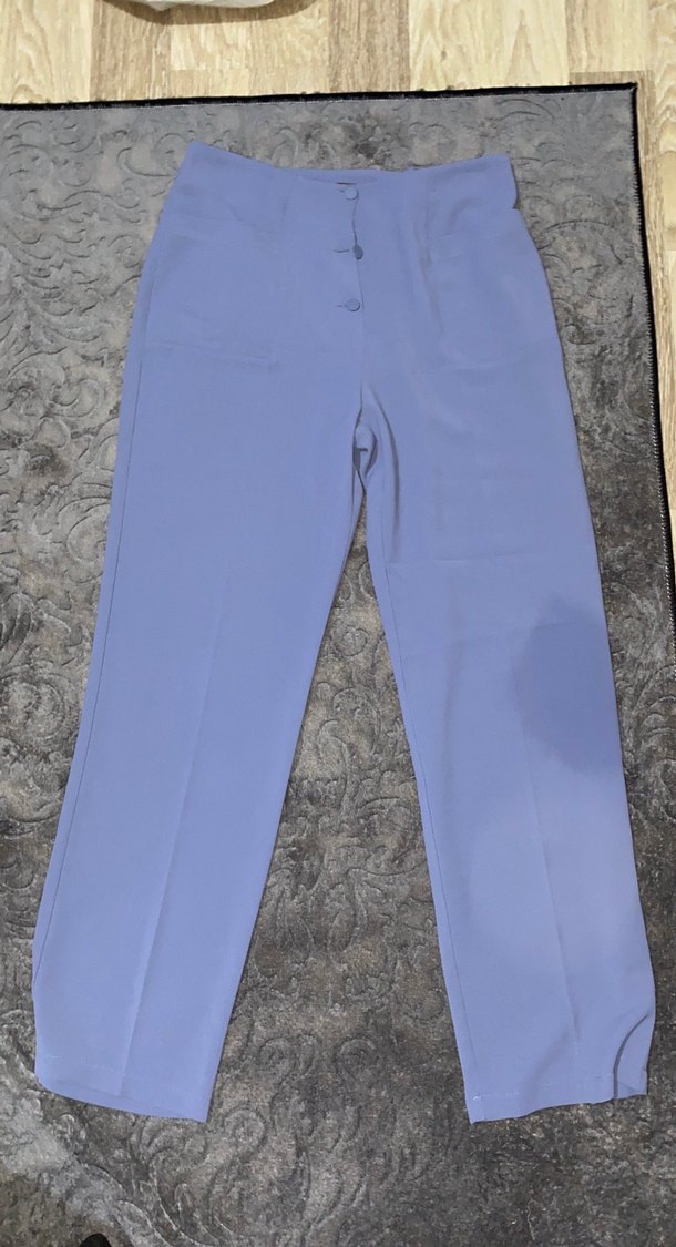 Düğmeli, midi boy, düz desenli mavi sentetik kumaştan kadın pantolon, normal kesim ve iş ortamına uygun.