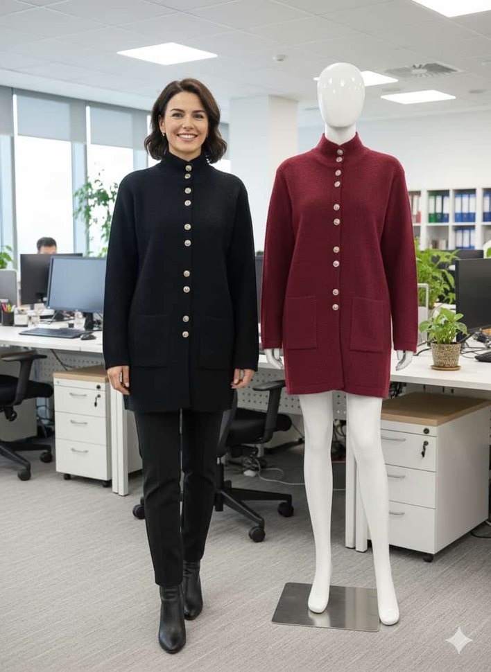düğmeli ön detaylı, normal kesim midi ofis ceketi. Uzun kollu ve yumuşak, sıcak kumaştan üretilmiştir. Trendy casual ofis stiline uygundur.