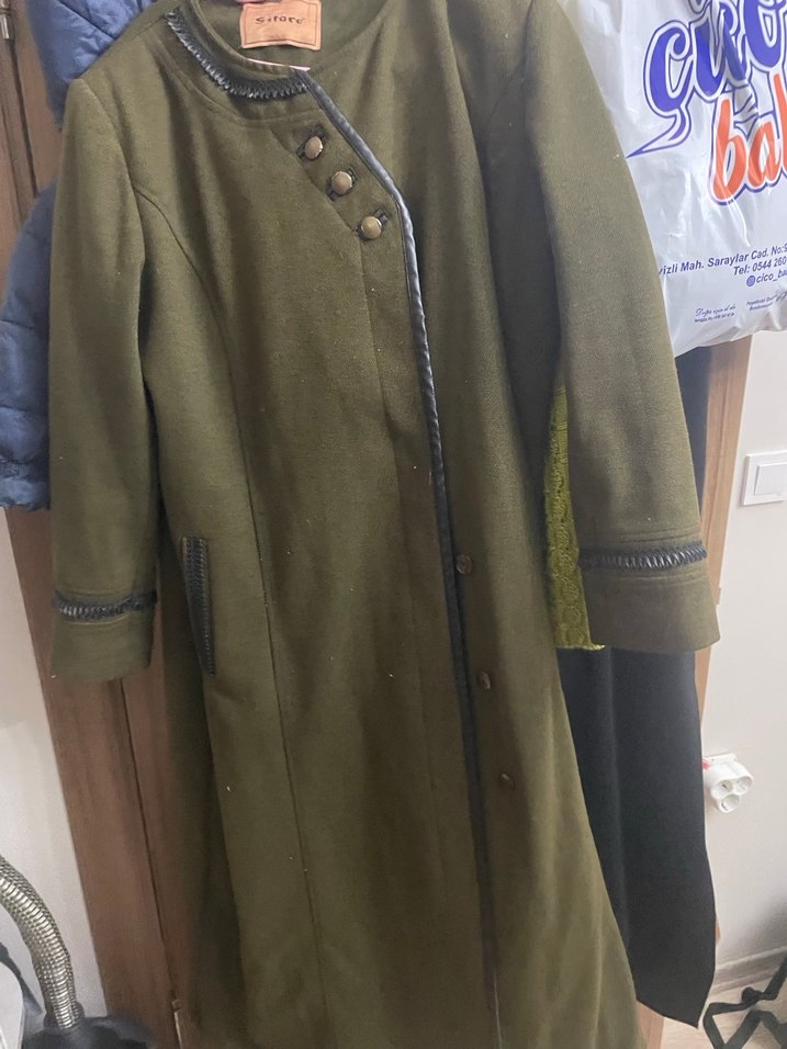 Düğmeli ön ve kesik yakalı midi uzunlukta, koyu haki renk süet kaban. Uzun kollu ve rahat kesim, günlük sokak stili için uygun. Unpatterned ve şık görünümlü.