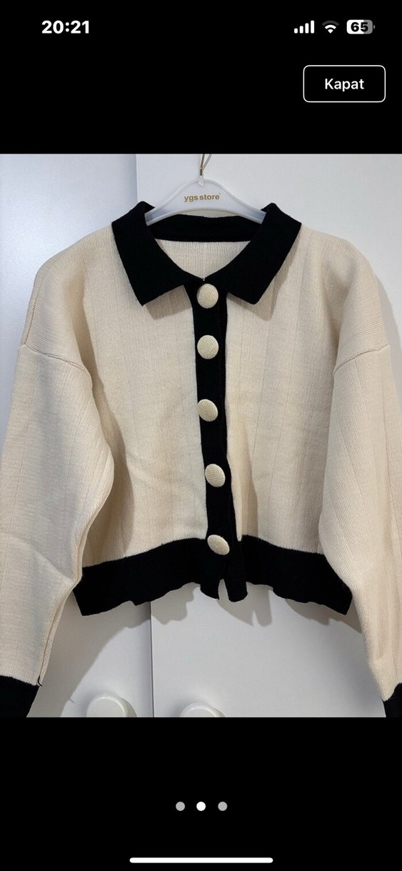 Uzun kollu, siyah detaylı yakalı beyaz hırka. Düğmeli, pamuklu kumaştan, kısa ve bol kesim. Günlük rahat sokak stiline uygun.