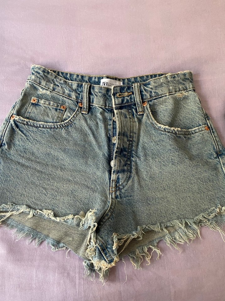 Düğmeli, gevşek kesim mini denim şort, pastel mavi tie-dye desenli, yıpranmış kenarlarla retro tarzda. Günlük kullanım için uygundur.