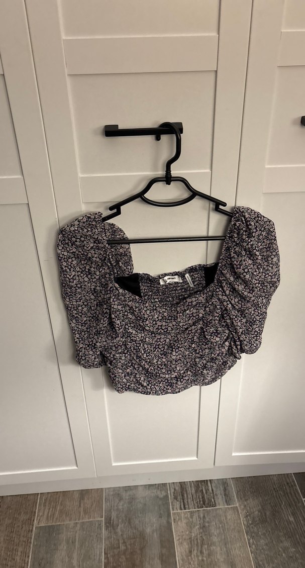 Düğmeli, kısa kesim ve dar kesim bu bluz, askılı kolları ve tekne yaka detayıyla dikkat çeker. Gri renkli, desenli yumuşak sentetik kumaştan üretilmiştir.