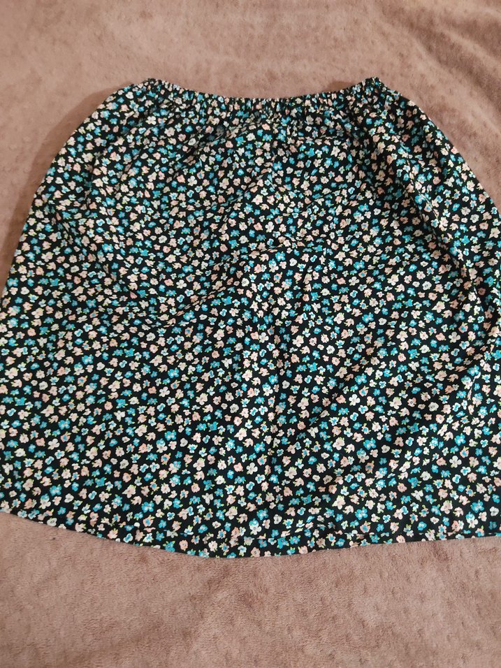 Düğmeli, bol kesim kısa mini hamile eteği, koyu renkli çok renkli çiçek desenli, bohem tarzında. Günlük kullanım için rahat.
