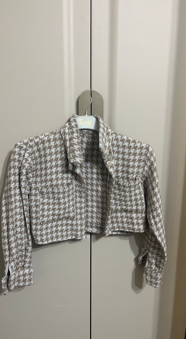 Düğmeli önü ve uzun kollu kısa kesim kadın ceketi. Bej ve gri desenli, notlu yakalı, günlük kullanım için uygun şık sokak stili.