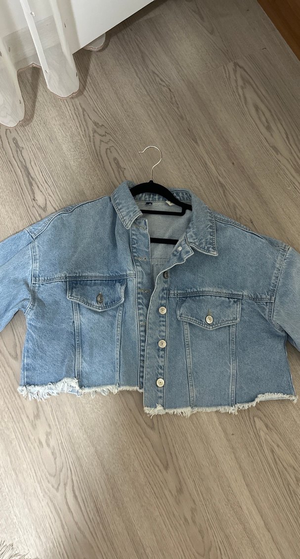 Düğmeli ön kısmı, kısa ve bol kesimi ile kadın kot ceket. Çift cep ve yakası notched lapel. Sokak stiline uygun, mavi renkte ve uçları hafif yıpranmış.