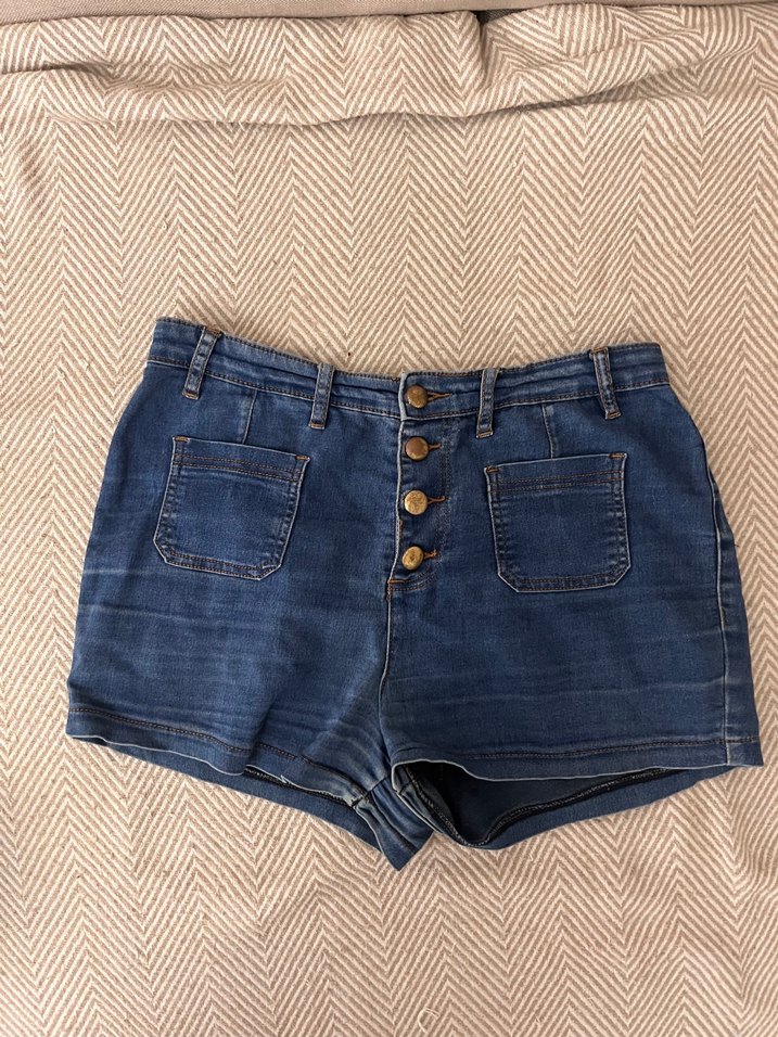 Düğmeli ön kısmı ve kısa mini kesimiyle kadınlar için dar kesim kot şort. Mavi, desensiz ve günlük kullanım için uygun.