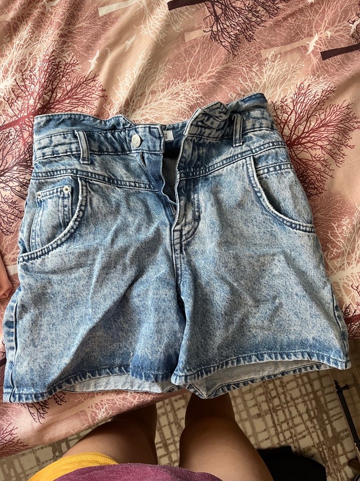 Düğmeli, mini kesim ve mavi-gri tonlarda hafif batik desenli, rahat sokak stiline uygun kadın kot şort.
