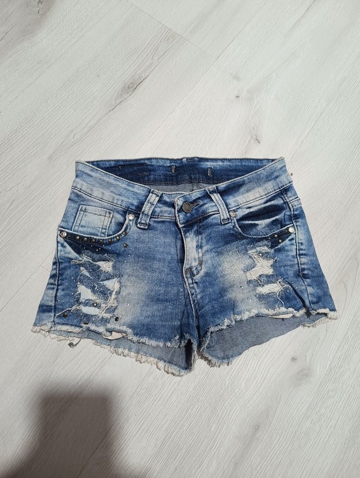 Düğmeli, kısa ve fitted kesim kadın kot şort, mavi tie-dye desenli, günlük kullanıma uygun sokak tarzı şort.