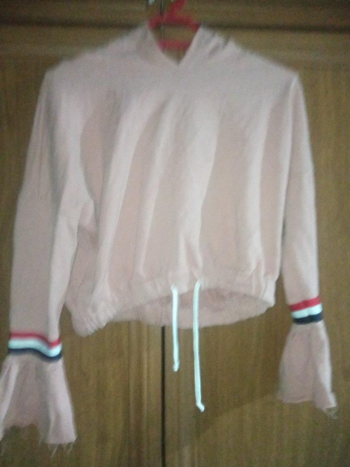 Uzun kollu, çizgili manşetli ve düğmeli beyaz kadın sweatshirtü. Bol kesim, kısa boy ve bağcıklı alt, sentetik kumaştan günlük sokak stili için uygundur.