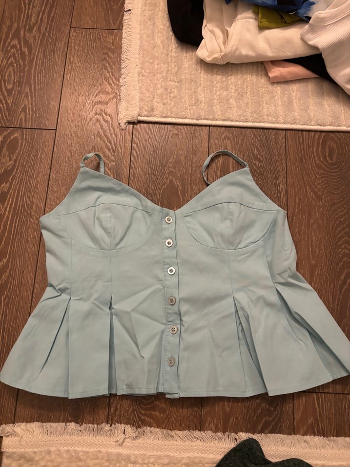 Düğmeli, ince askılı, keten kumaştan yapılmış pastel mavi mini, vintage tarzda rahat ve şık bir üst.