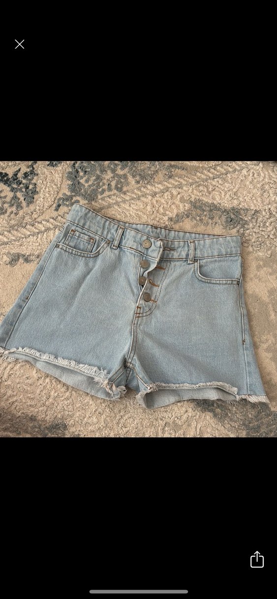 Düğmeli, bol kesim kot şort, kısa boyda. Günlük kullanıma uygun rahat bir sokak stili sunar.