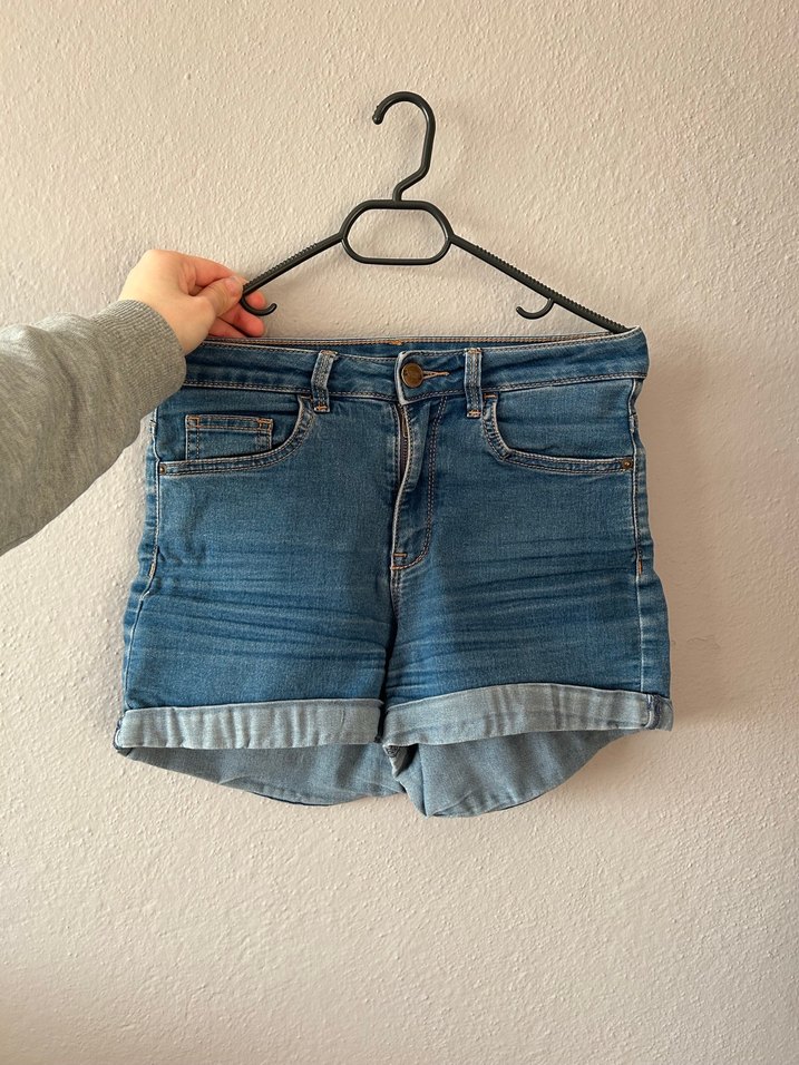 Düğmeli, bol kesim mini kot şort, mavi ve gri tonlarında hafif batik desenli, rahat sokak stili için uygun.