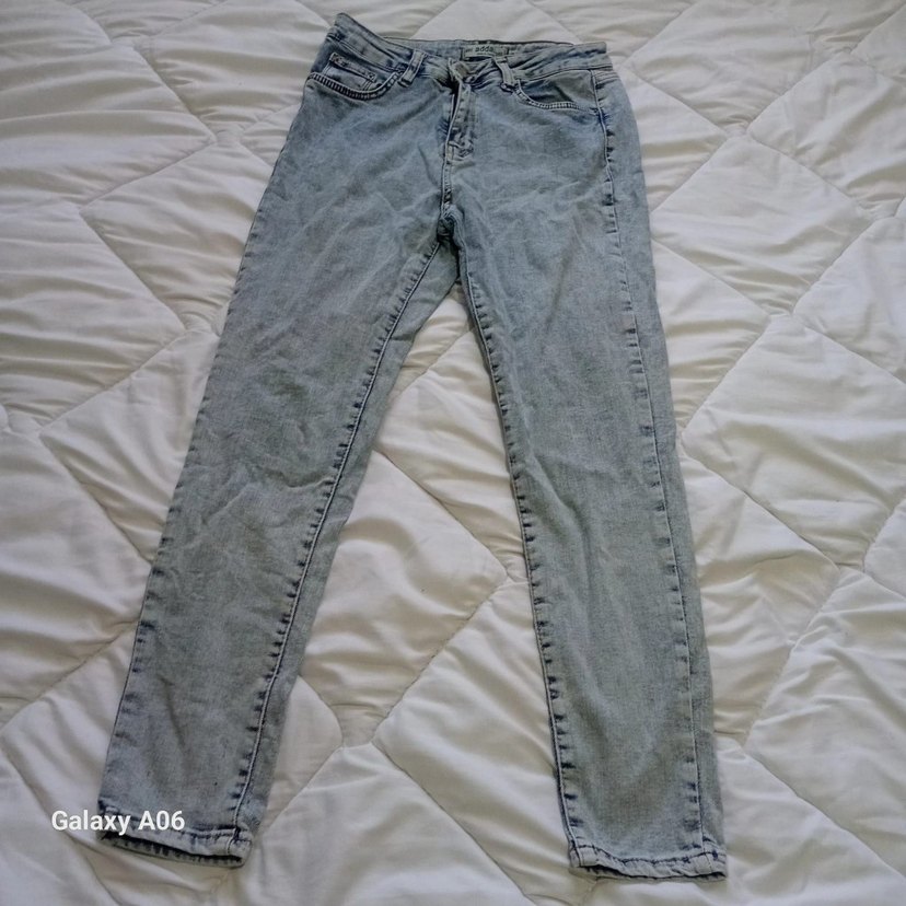Düğmeli ön kısmı ve baskılı deseniyle, günlük sokak stili için uygun, dar kesim mini mavi-gri denim kot pantolon.