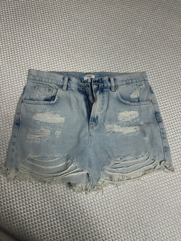 Düğmeli, bol kesim mini mavi denim şort. Yıpranmış detaylarıyla günlük rahat sokak stiline uygun.