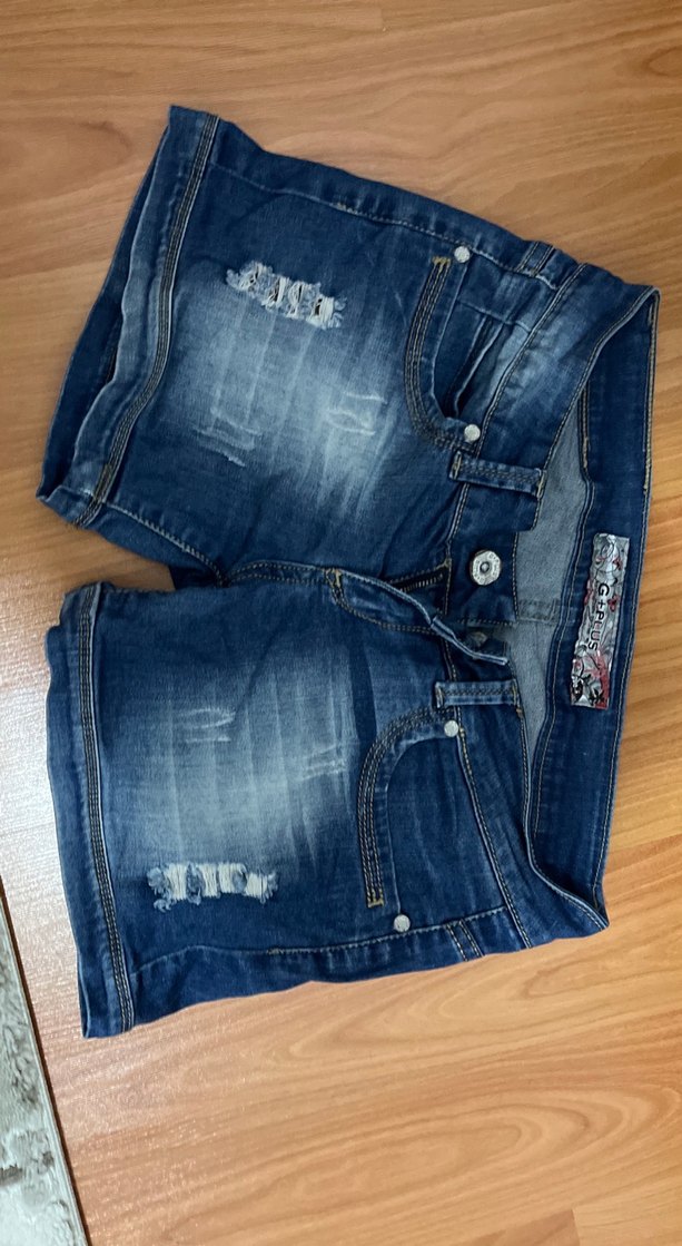 Düğmeli, hafif yıpratma detaylı, fitted kesim mini mavi denim şort, gündelik sokak stili için uygun.