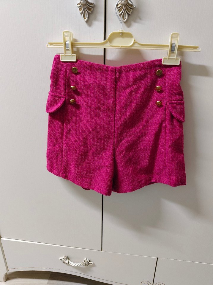 Canlı pembe renkte düğmeli, triko kumaştan mini şort, günlük rahat sokak stili için uygun.
