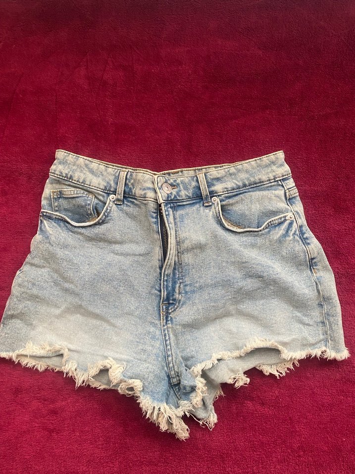 Düğmeli, pastel mavi tie-dye desenli, mini boy, fit kesim kot şort. Püsküllü etek ucu ile bohem tarzda.