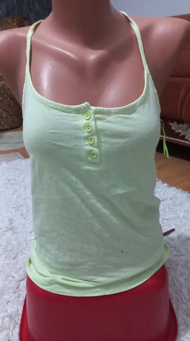 Pamuk kumaştan, düğmeli ön kısmı ve yuvarlak yakası olan, yeşil renkli, kısa ve dar kesim kadın atlet.
