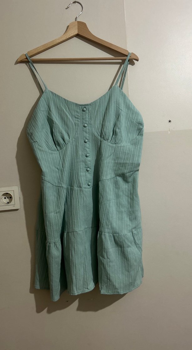 Mint yeşili keten kumaştan, düğmeli, askılı ve straplez yaka detaylı, bol kesim midi elbise. Günlük kullanıma uygun rahat bir modeldir. Hiç kullanılmadı boyu biraz minidir