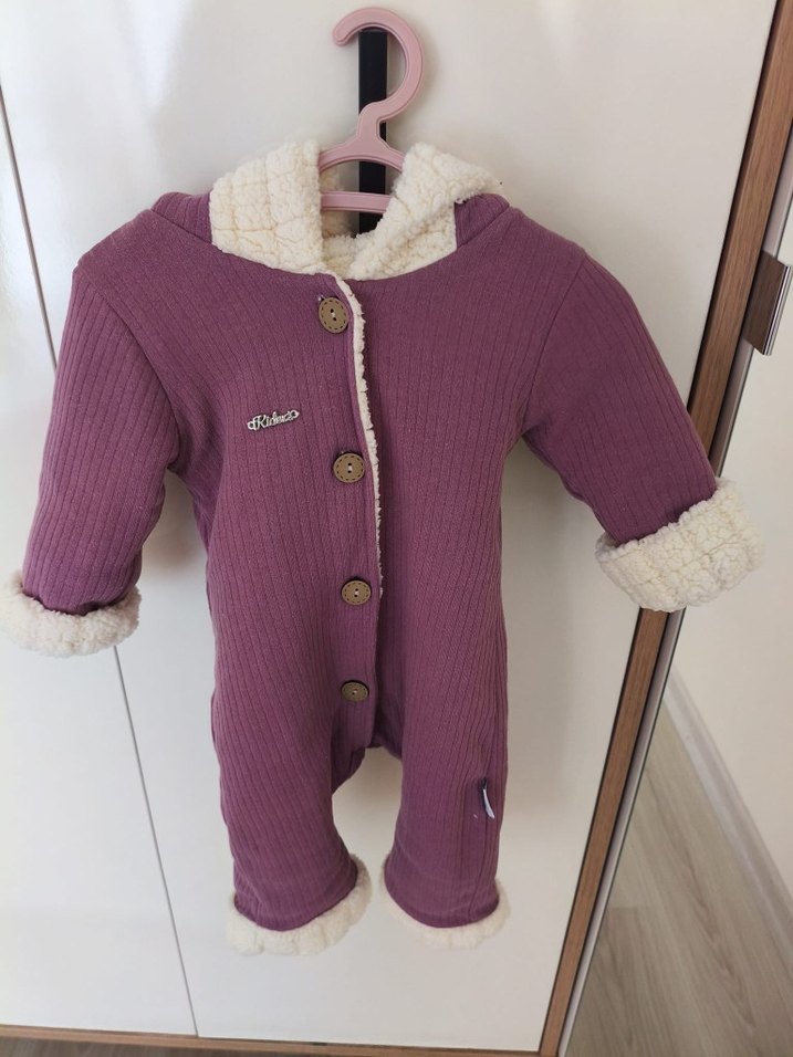Düğmeli, mor renkte bebek tulumu, yumuşak iç astarlı, sıcak tutar. ❄️