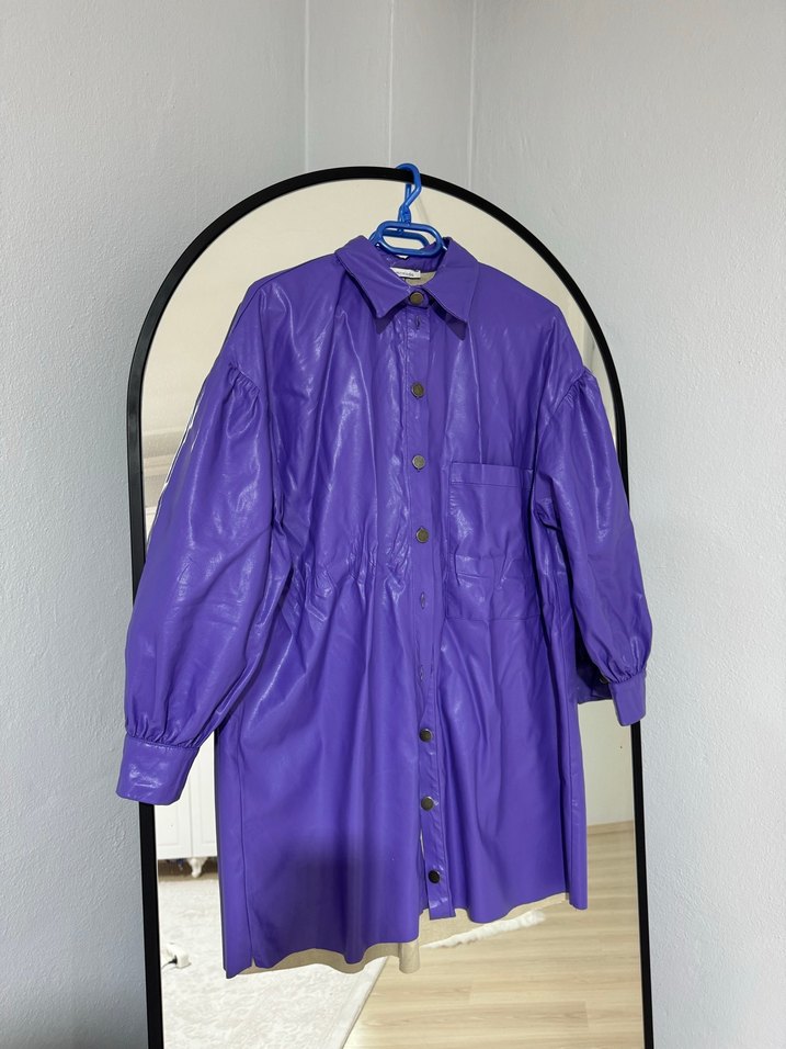Mor ince deri ceket, düğmeli ve yakalıdır. Uzun kollu, salaş kesim, parlak yüzeyli ve midi boydadır. Sokak stiline uygun, desensiz tasarım. Çok az kullanıldı oldukça yenidir