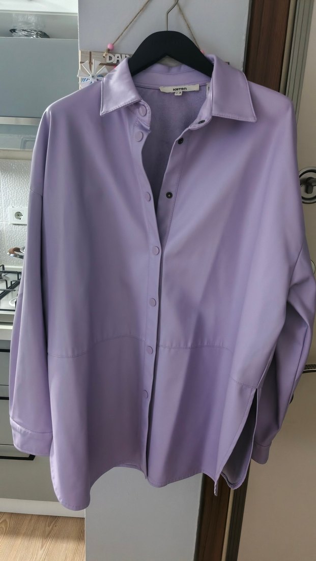 Düğmeli, uzun kollu, normal boyda, pastel mor midi gömlek. Yumuşak sentetik kumaştan, bol kesim ve çıtçıtlı ön detaylı. Günlük kullanıma uygun casual tarzda. Deri dir