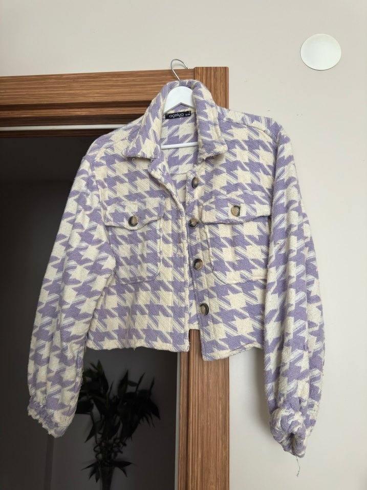 Düğmeli, uzun kollu, notched lapel yakalı, bol kesim, pastel mor renkli ve desenli kadın gömleği. Yumuşak sentetik kumaştan, günlük sokak stili için uygun.