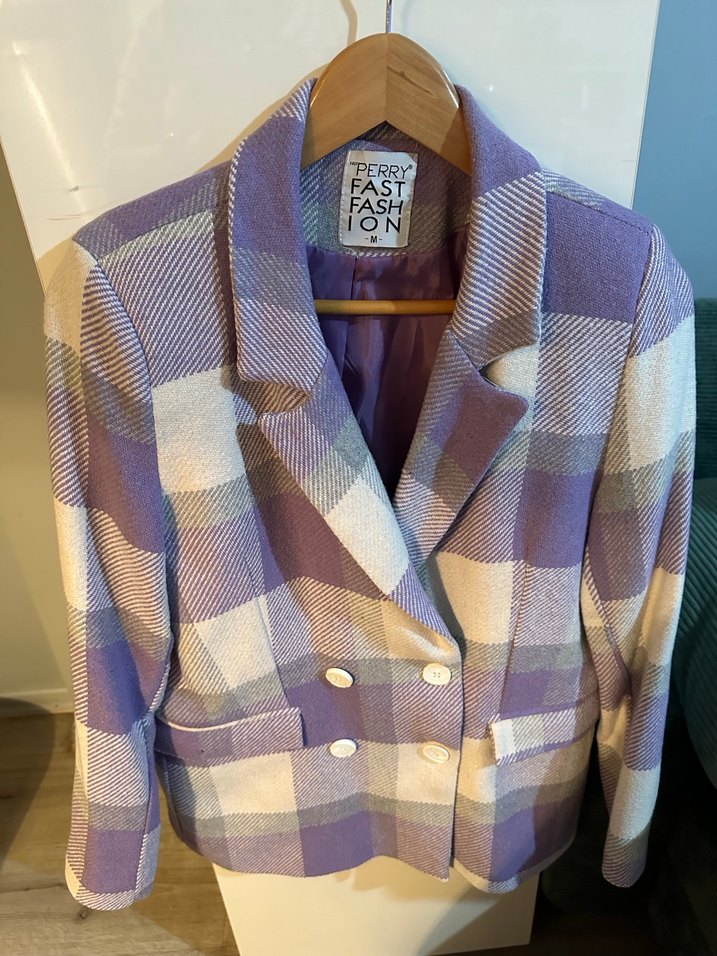 Pastel mor ekose desenli yün kumaştan, düğmeli, normal kesim, uzun kollu ve midi boy kadın blazer. Günlük sokak stili için uygundur.