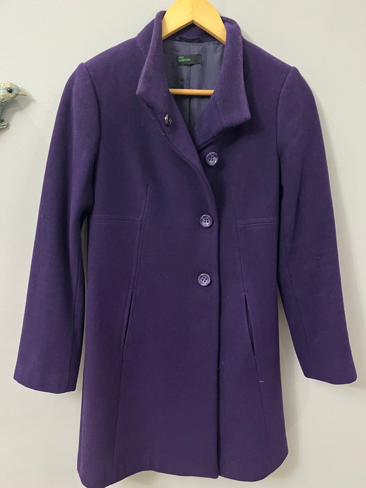 Düğmeli, yüksek yakalı mor kaban. İki yan cep ve oturaklı kesim ile şık ve sıcak tutar. Ürün tertemizdir.Hiçbir renk solması falan yoktur.