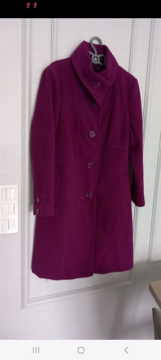 Uzun kollu, düğmeli mor kaban. Yaka kısmı yüksek ve yan ceplidir. Sıcak tutan şık bir dış giyim ürünü.